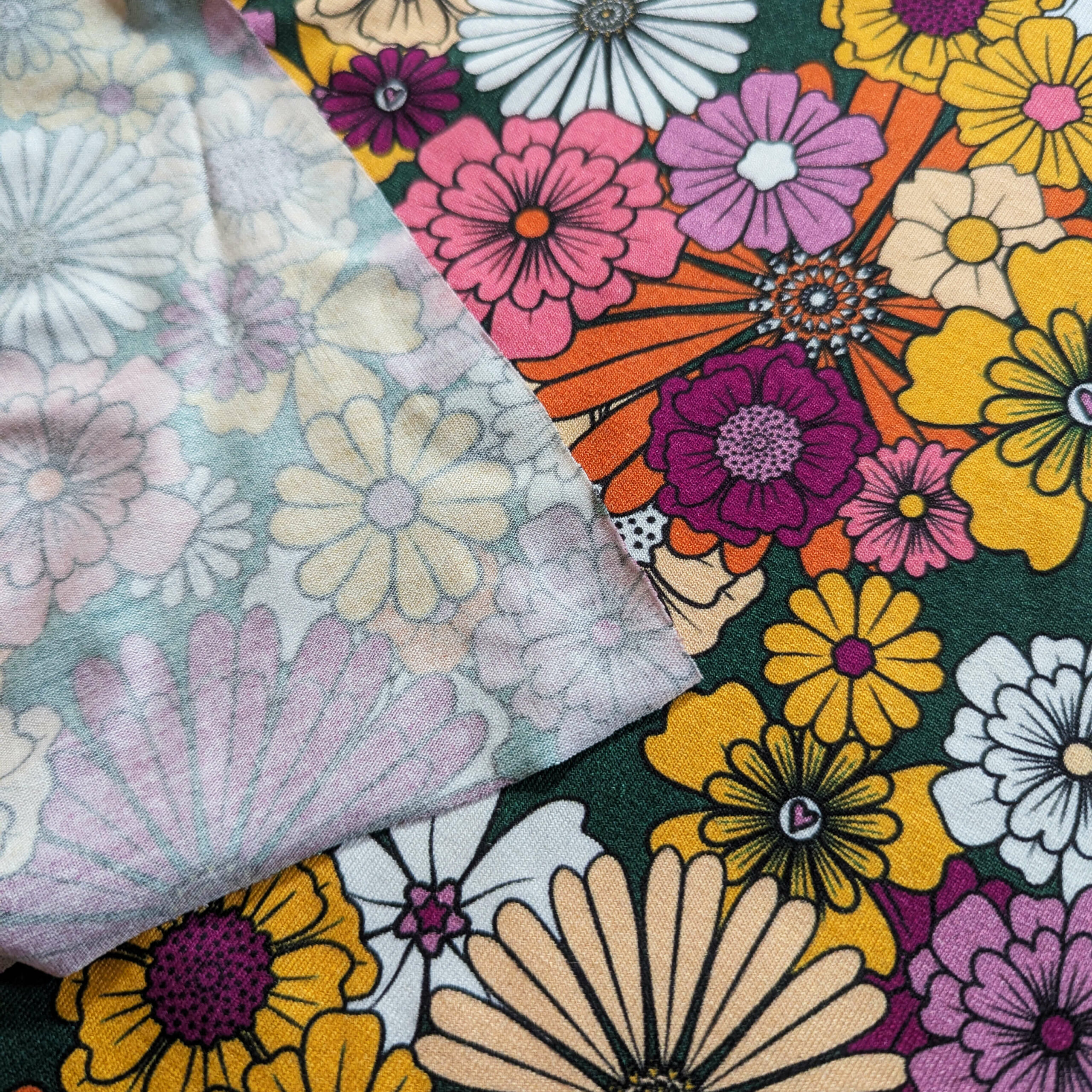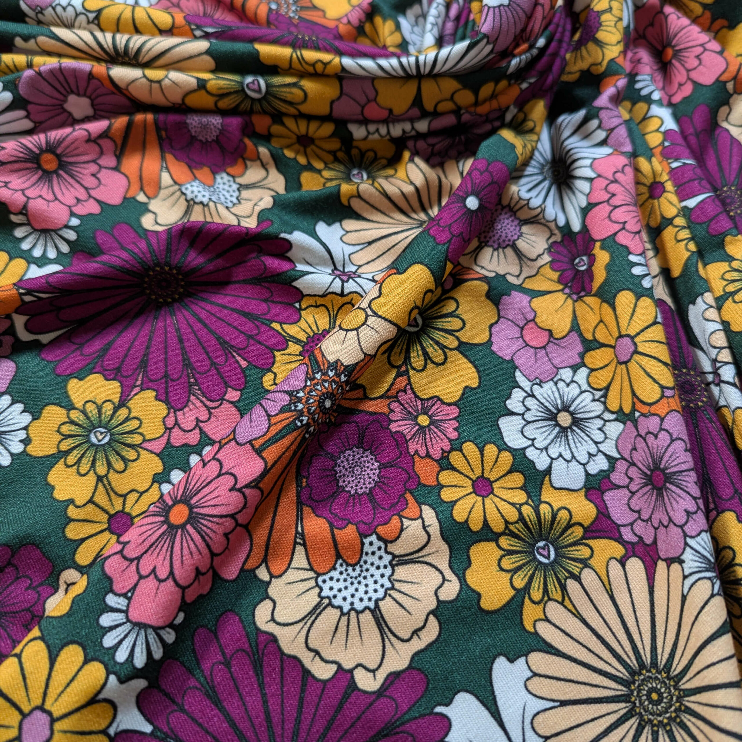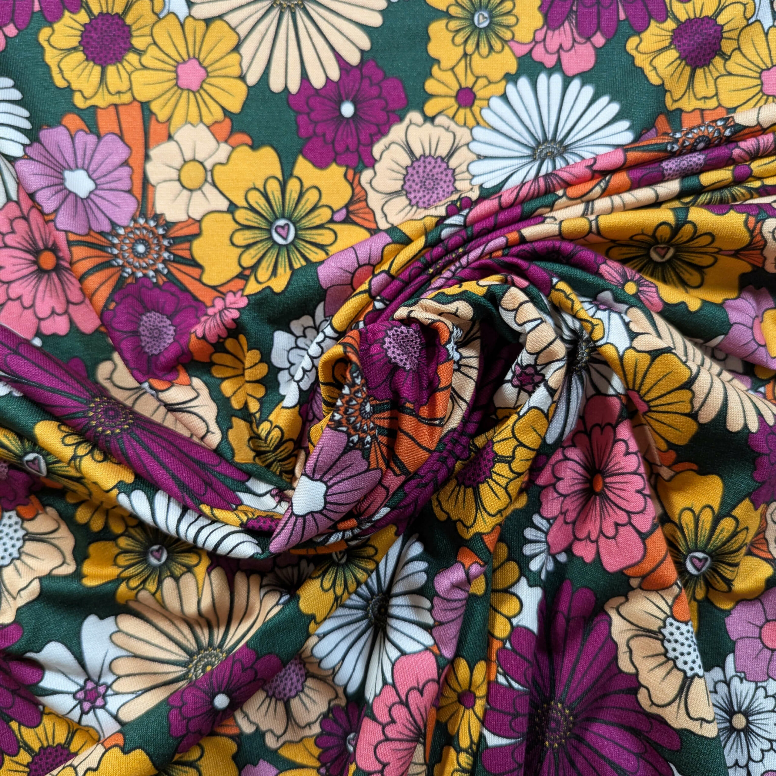 BONNIE, des fleurs par milliers blanche, jaune, violette, sur un fond vert bouteille.