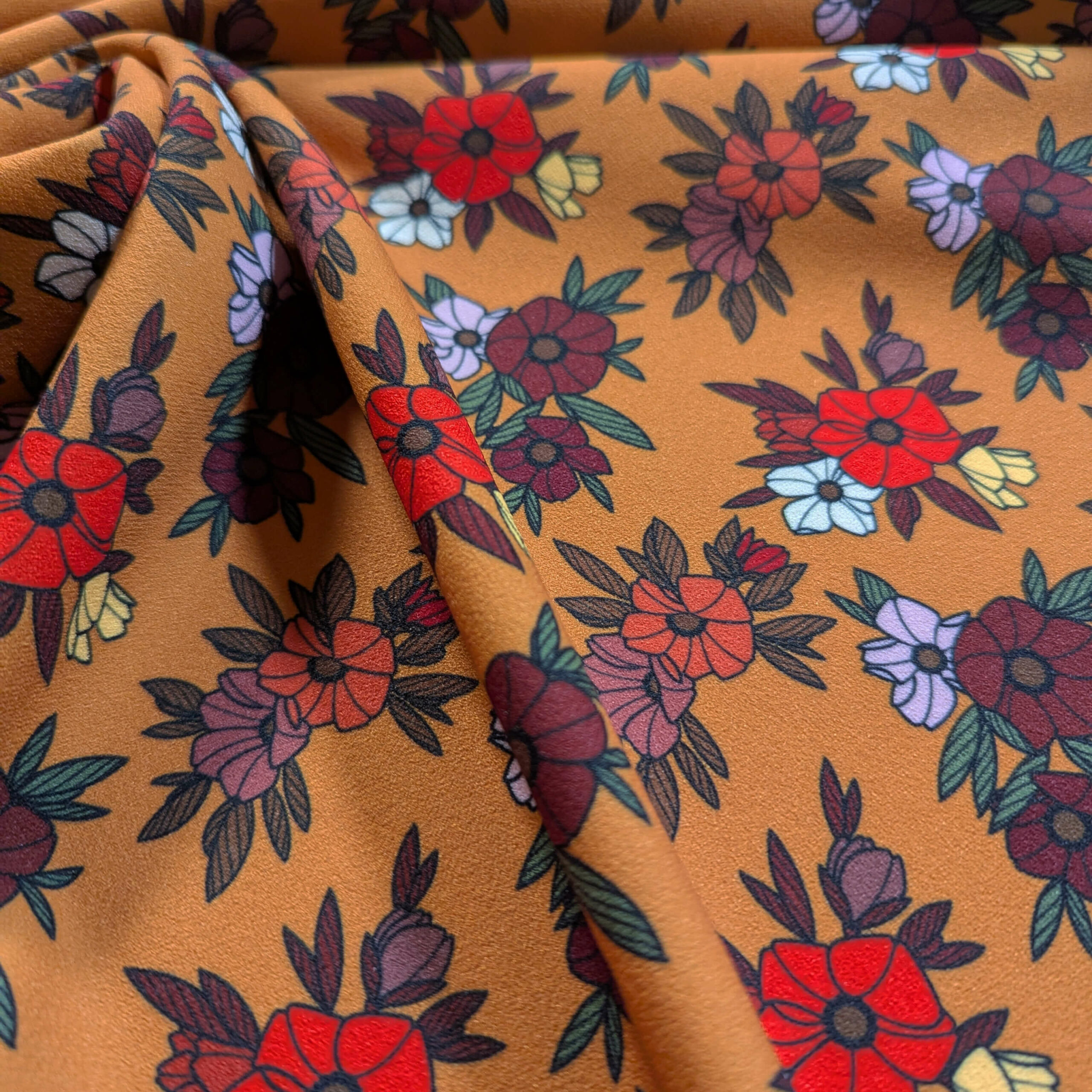 APRIL honey, des couleurs années 70, un délicat motif de petites fleurs rouges, bordeaux et marrons. dessiné à 4 mains avec FWIP tattoo.